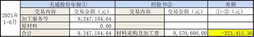 2021年1-6月,天通股份半年报披露向昱能科技销售加工服务等合计924.72万元,昱能科技招股书披露的同期向天通精电采购材料及加工费957.06万元,两数据相差32.34万元。