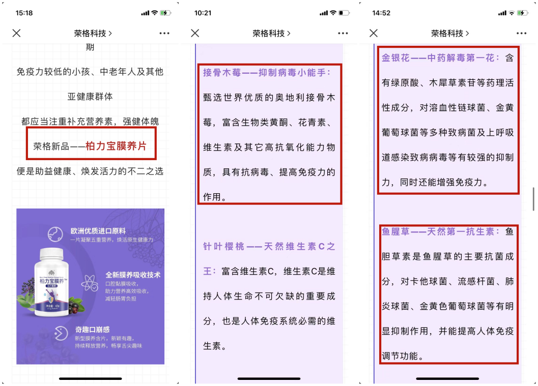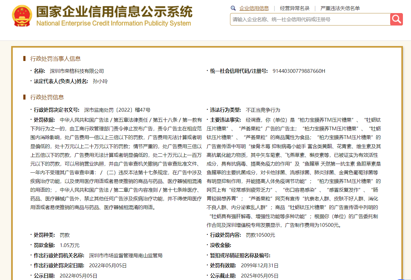行政处罚决定书(深市监南处罚〔2022〕稽47号)显示,经调查,荣格科技“柏力宝膜养TM压片糖果”“牡蛎钛压片糖果”“芦荟果粒”三款商品的属性为食品。但在产品“柏力宝膜养TM压片糖果”的广告宣传语中写明“接骨木莓,抑制病毒小能手,富含类黄酮、花青素、维生素及其高抗氧化能力物质,其中矢车菊素、飞燕草素、槲皮素等,已被证实为有效活性成分,具有抗病毒、提高免疫力的作用”“鱼腥草,天然第一抗生素,鱼胆草素是鱼腥草的主要抗菌成分,对卡他球菌、流感球菌、肺炎球菌、金黄色葡萄球菌等有明显抑制作用,并能提高人体免疫调节功能”“柏力宝膜养TM压片糖果”的网页上有“经常感到疲劳乏力”“伤口容易感染”“感冒反复发作”“肠胃较弱想养胃”等内容;在“芦荟果粒”网页宣传“抗衰老人群、皮肤不好人群、消化不良人群、内分泌紊乱人群”;在商品“牡蛎钛压片糖果”的广告宣传语中列明的“牡蛎具有强肝解毒、增强性功能等多种功能”。