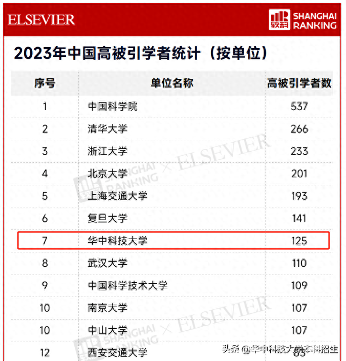 近日,爱思唯尔重磅发布2023“中国高被引学者”榜单。在此次上榜高校中,共有10所大学的高被引学者数量超过了100位,华中科技大学以125位高被引学者数,居全国高校第6名,入选学者数量相比去年增加12位。