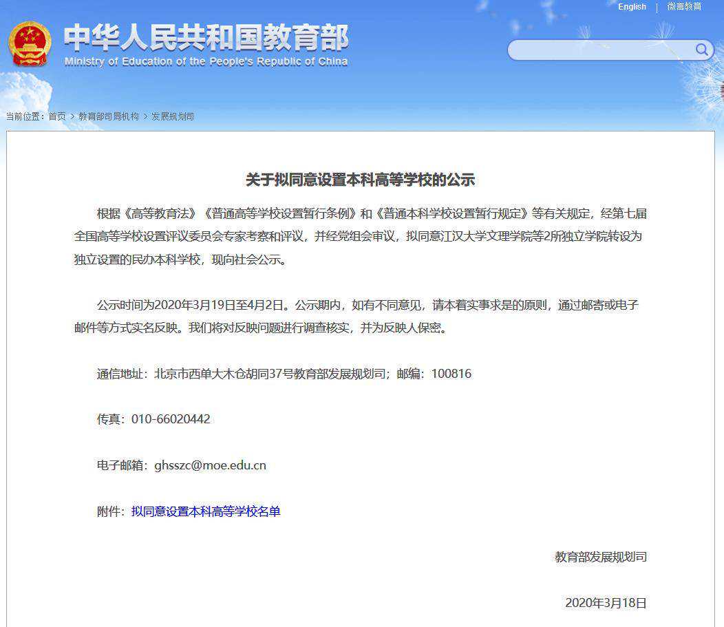 3月19日,教育部发展规划司官网发布《关于拟同意设置本科高等学校的公示》(以下简称《公示》)。国内两所独立学院被公示,其中一所就在广西柳州。