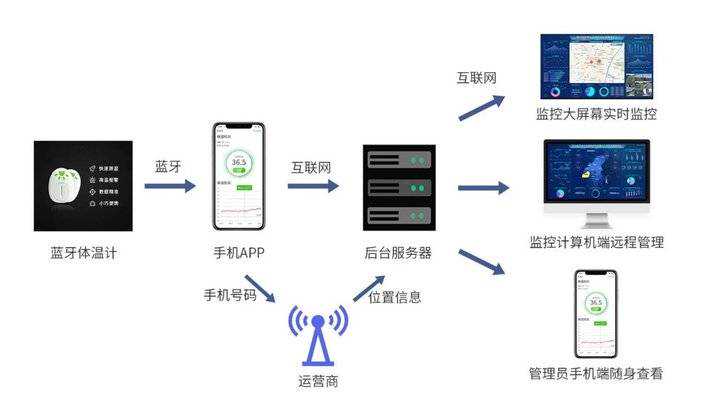智能体温监控系统由穿戴式智能体温仪、体温采集APP、体温监控管理APP、监控管理平台四部分组成。通过智能体温传感器精准测量体温,当体温测量完成后,传感器通过用户手机APP将体温数据上传到云端,并通过云端后台分发到政府监管端及一线监管人员的手机上,做到自动实时监控,体温异常自动报警,节省人力、减少接触的同时,提高响应速度。