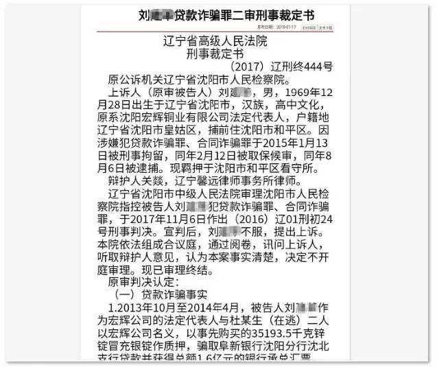 据法院认定,在2013年10月至2014年4月,被告人刘某某作为宏辉公司的法定代表人与杜某(在逃)二人以宏辉公司名义,以事先购买的35193.5千克锌锭冒充银锭作质押,骗取阜新银行沈阳分行沈北支行贷款,并获得总额1.6亿元的银行承兑汇票,致阜新银行实际损失8000万元。