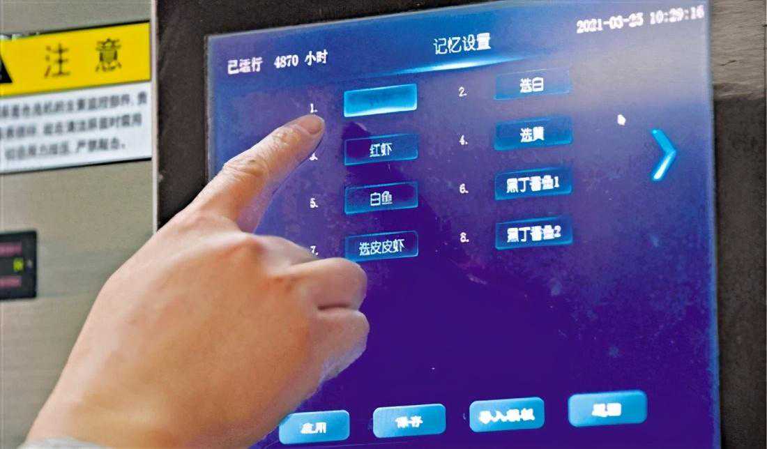 “这是我们最新投入使用的画像选检测机。”华盛生产部主管吴英华是我们本站的“向导”,在他的引导下,我们看见一条运输带上正运输着成千上万只虾皮。在机器的前方,设置着一个显示屏,可以设置产品的颜色和形状,调整仪器的流量、精准度。