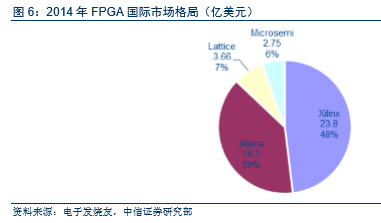 2014年Xilinx、Altera两大公司营业收入分别为23.8亿美元和19.3亿美元;而Lattice和Microsemi(仅FPGA部分)收入分别为3.66亿美元和2.75亿美元。赛灵思2016年、2015年和2014年的研发费用分别为5.34亿美元、5.26亿美元和4.92亿美元,占当年公司营收的比例分别为22.73%、23.75%、20.71%。公司研发投入主要覆盖新的集成电路设计,为硬件和嵌入式软件开发新的软件设计自动化工具,逻辑知识产权的设计和引进先进的半导体制造工艺。公司的研发投入使得公司在新品开发和专利获取方面不断取得新的成果,保证了公司的长期竞争力。截止2016年年末,该公司拥有3500多个美国专利和300多项专利申请。