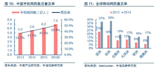 中国手机网民渗透率全球领先。自2013年起,手机网民规模已经超越PC互联网用户。截至2015年底,我国手机网民数达6.2亿,预计2016年可达7.0亿,手机网民在网民中的占比超过90%。就普及率来看,我国手机网民已占全体人口的50.4%,高于亚洲平均水平,亦高于美洲、欧洲。