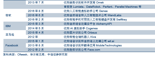 科技公司亦通过投资并购获取人工智能技术平台与研发人才。包括苹果、谷歌、英特尔、微软等公司在内的科技巨头,纷纷外延收购人工智能创业公司,标的公司主要集中于计算机视觉、图像识别、语义识别等领域。