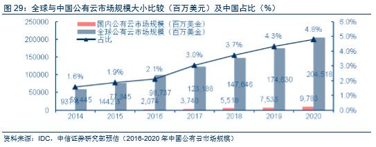 中国云市场起步较晚,未来增速或将显著高于全球。2016年中国的营收规模占全球云市场仅为2%;相对美国营收627亿美元,占比超63%。中国云市场才刚刚起步,与美国还有很大差距。我们预测中国云计算市场将从2016年的21亿美金快速增长到2020年的98亿美金,CAGR高达47%,显著高于美国的19%和全球的20%。中国市场在全球云市场的影响力将进一步提升。