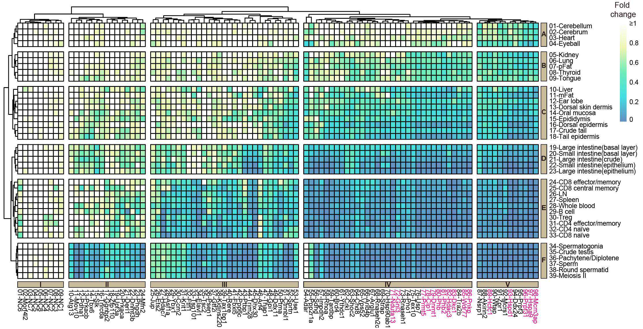 微型扰动图谱。展示100个sgRNA分别在39个组织/细胞类型中的丰度。
