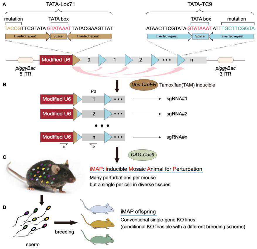 iMAP融合了Cre-loxP和CRISPR-Cas9技术,其核心组成部分是一个转基因序列,它由U6启动子和下游一串gRNA表达单位构成。