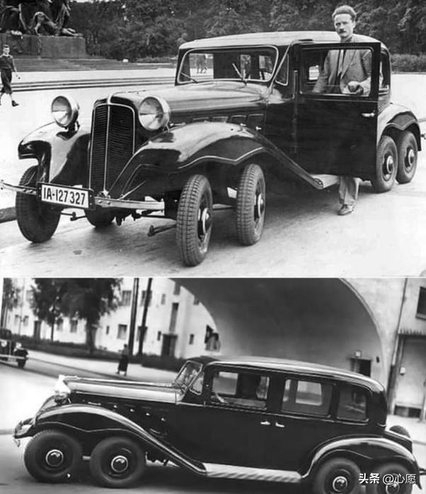 081935年,一个男人和一辆拥有8个轮胎的汽车合影,这要是在下雪时开,应该不会有打滑的情况吧。