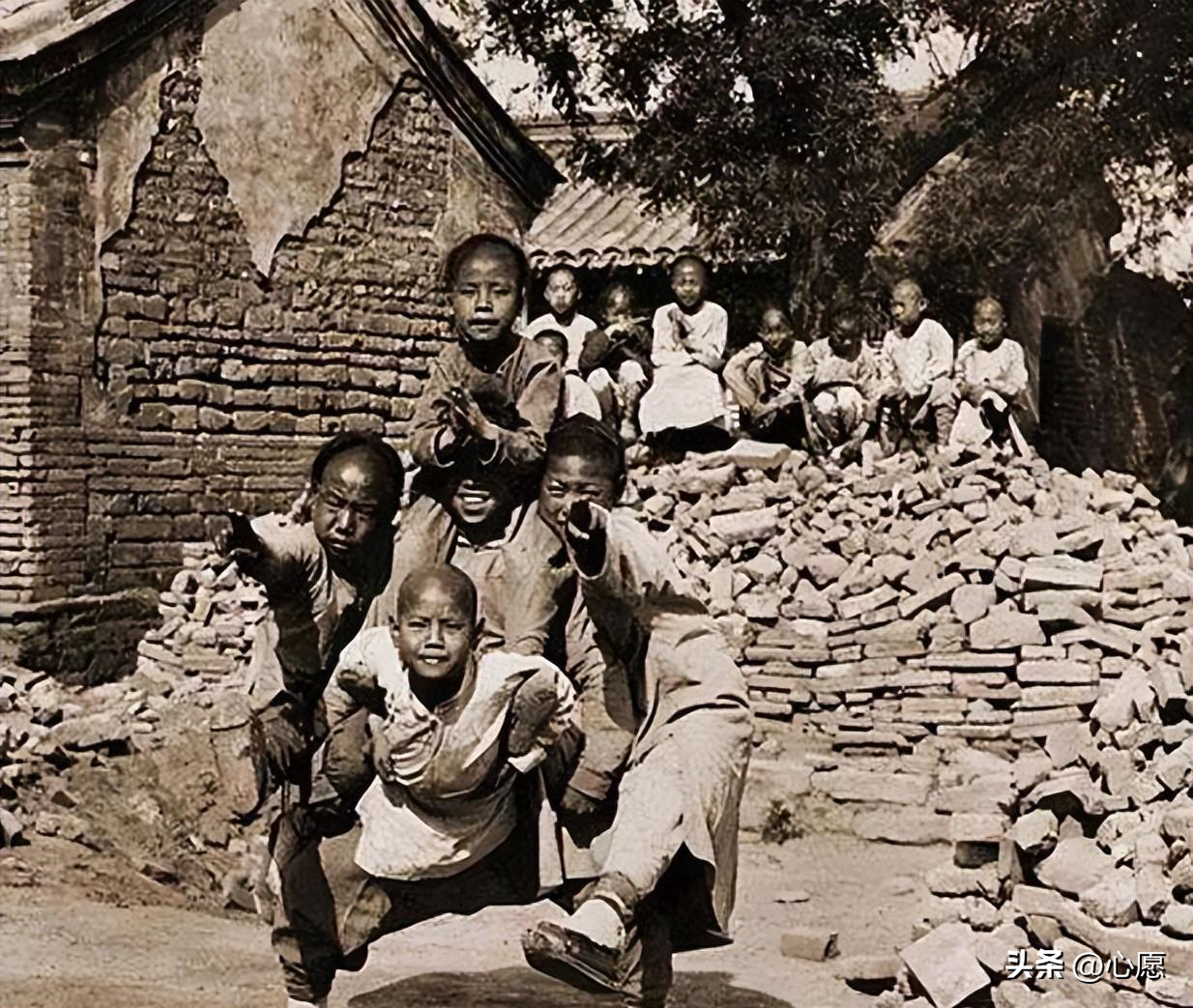 29戏班子里出来卖艺求生的孩子,五个孩子正在表演叠罗汉
