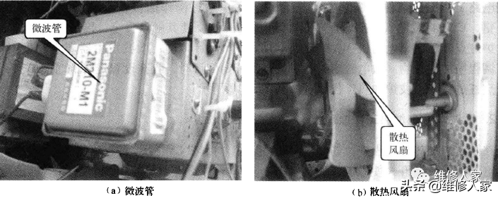 微波管是微波炉的核心部件,它是一个产生和发射微波的真空电子管,内部由直热式阴极、阳极、永久磁铁和天线组成。微波管在灯丝电压和直流负高压的作用下产生微波,并由天线传给炉腔。散热风扇的作用是对漏感变压器和微波管工作时产生的热量进行强制散热,保证它们工作安全可靠。